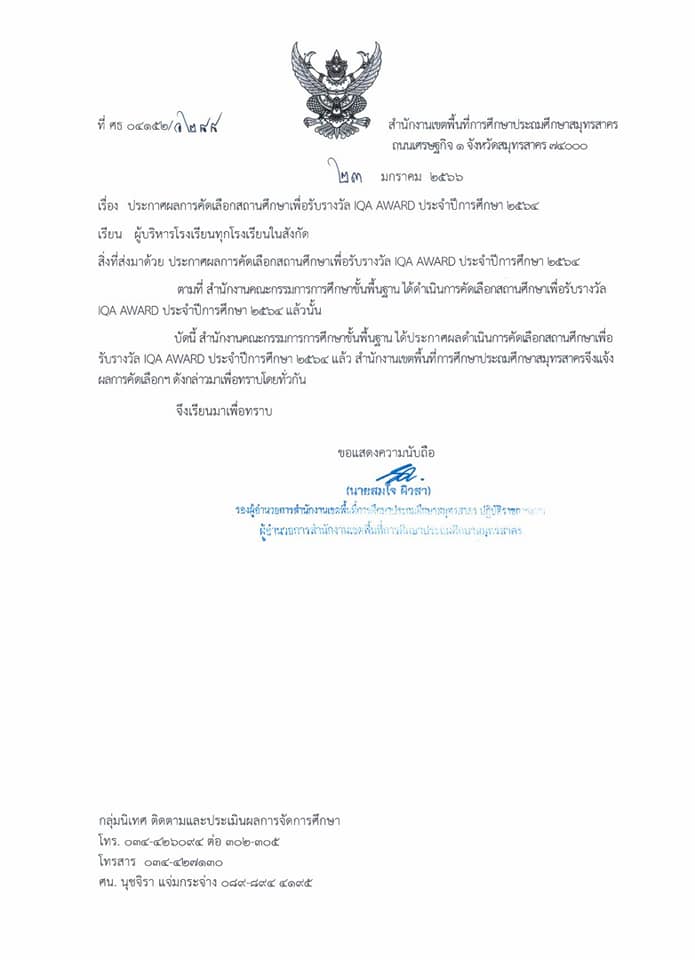 ประกาศผลการคัดเลือกสถานศึกษารับรางวัล IQA AWARD ประจำปี 2564 By watyokkabatschool30 มกราคม 202327 สิงหาคม 2023ข่าวประชาสัมพันธ์ ประกาศผลการคัดเลือกสถานศึกษา รับรางวัล IQA AWARD ประจำปี 2564 ระกาศผลการคัดเลือกสถานศึกษารับรางวัล IQA AWARD. ประจำปี 2564 จากสำนักงานคณะกรรมการการศึกษาขั้นพื้นฐาน สพป.สมทุรสาคร ประเภทสถานศึกษาขนาดกลางโรงรียนวัดยกกระบัตร “ได้รับรางวัลยอดเยี่ยม” Post Views: 214